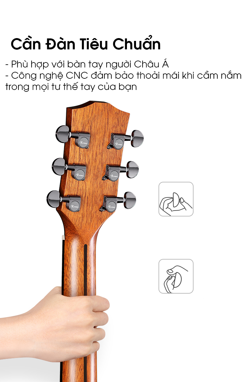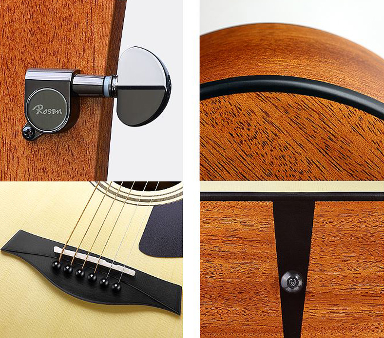 Guitar Acoustic Rosen G15 có dáng D và dáng A với kích thước thùng đàn lớn cho tiếng đàn to, ấm và đầy hơn, phù hợp cho người mới học đàn. Rosen G15 có Lưng và Hông được làm từ Gỗ Mahogany, Đầu Đàn & Cần Đàn được làm từ gỗ Gỗ Nato, đặc biệt gỗ làm mặt đàn là nguyên tấm "Solid" Sitka Spruce được tuyển chọn vô cùng kỹ lưỡng và cẩn thận.