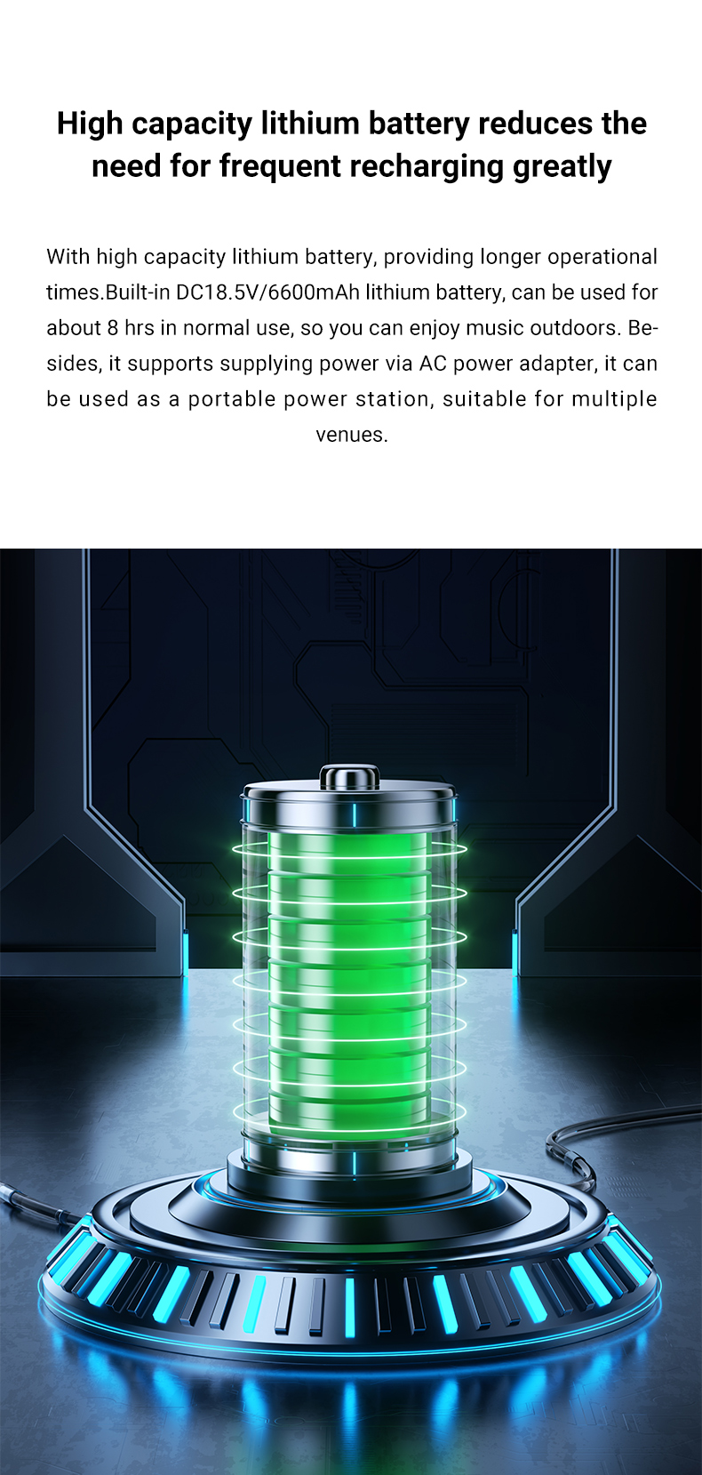 Được trang bị pin DC18.5V/6600mAh, ampli có thể hoạt động liên tục tới 8 giờ trong điều kiện sử dụng bình thường.