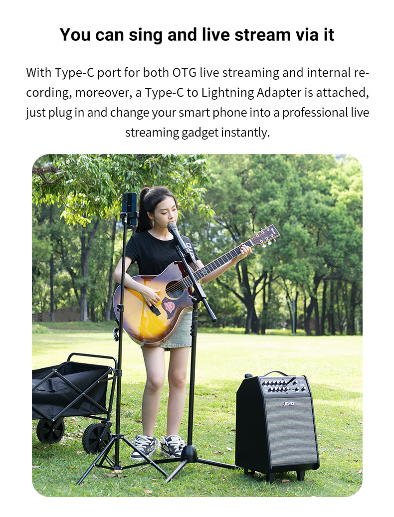 JOYO JPA866 tích hợp cổng Type-C OTG, cho phép livestream trực tiếp và ghi âm nội bộ dễ dàng.