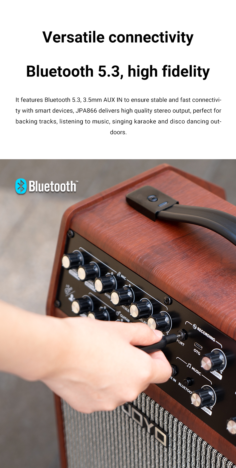 Amply di động JOYO JPA866 là lựa chọn hoàn hảo cho các nhạc công, nghệ sĩ đường phố, những buổi biểu diễn ngoài trời hoặc những buổi dã ngoại với bạn bè, gia đình. Với âm thanh mạnh mẽ, chất lượng cao, pin bền lâu, kết nối đa dạng và tích hợp Bluetooth 5.3, sản phẩm mang đến trải nghiệm âm nhạc chuyên nghiệp ở bất cứ đâu.