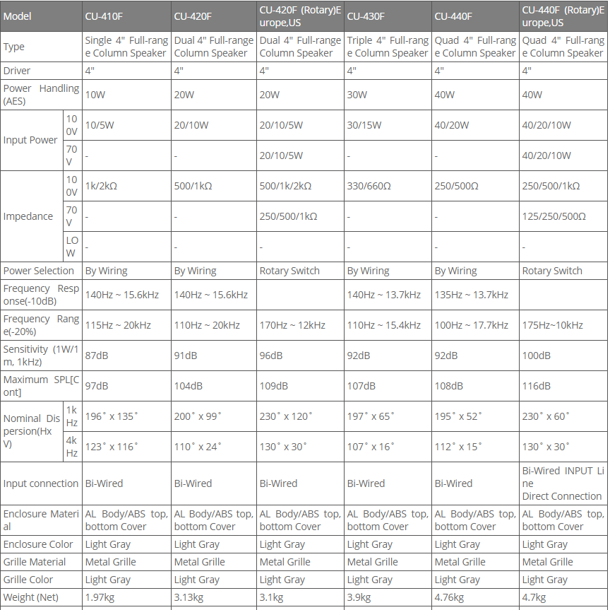- CU-440F với thiết kế mới của loa cột, dành cho loa trong nhà, và nó rất phù hợp với nội thất. Ngoài ra, loa cột đầu tiên có chứng nhận KS có thể được đảm bảo độ tin cậy và chức năng cao và nó cung cấp âm thanh chất lượng phong phú để phù hợp với nhiều tòa nhà sử dụng như cửa hàng bách hóa.